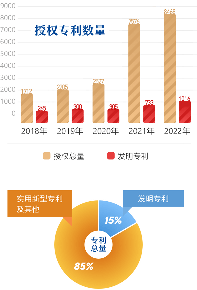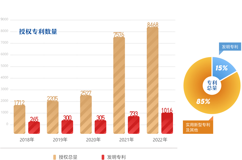截至2022年底,公司专利拥有总量30479件,其中:发明专利拥有总量4554件,高价值专利拥有总量2149件。2022年度,公司获得专利授权量8468件,发明专利授权量1016件,PCT申请量99件,每万人专利拥有量1540件。