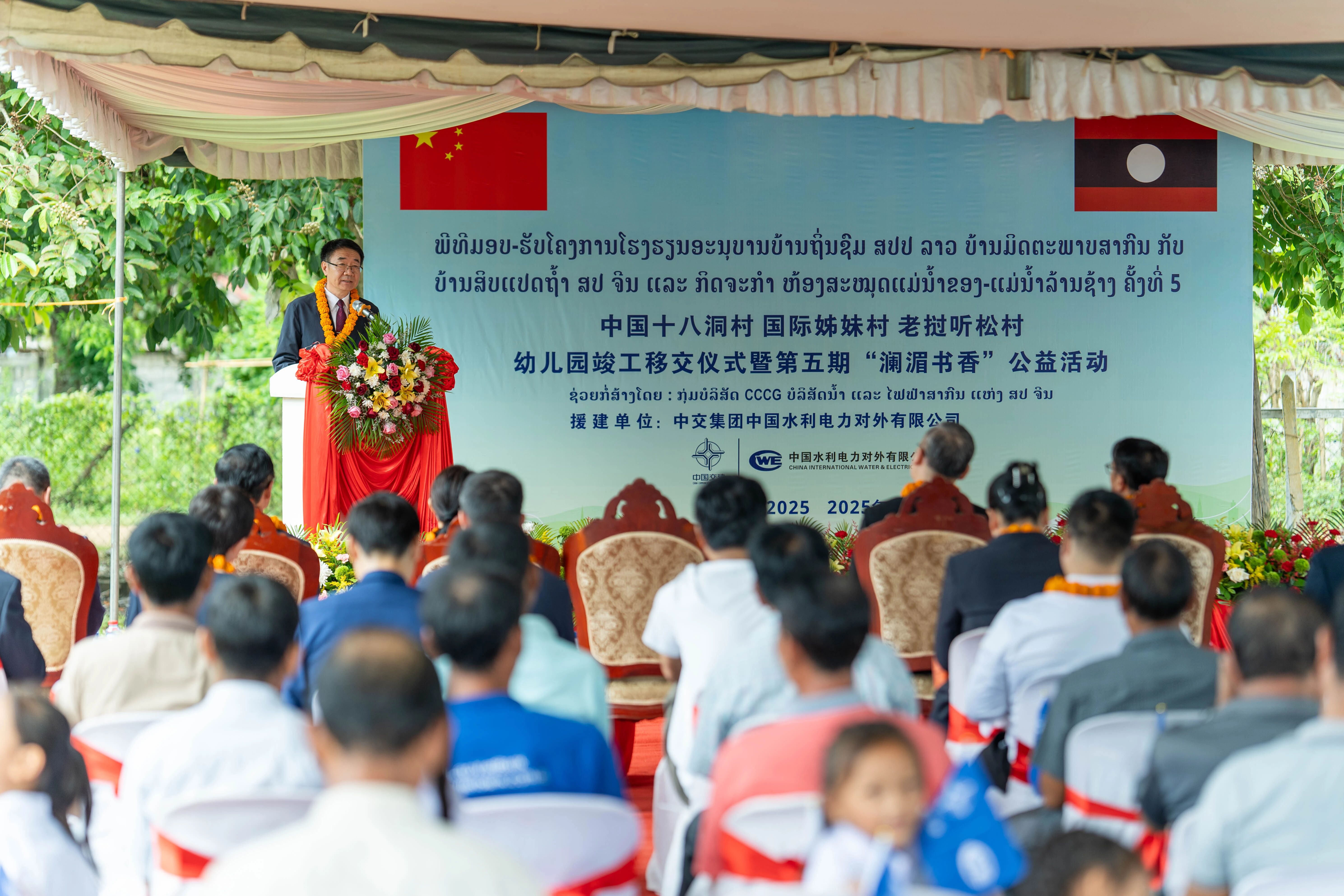 竣工移交仪式上,同步举办了第5期“澜湄书香”公益活动,双方代表共同为“澜湄书屋”揭牌。水电对外老挝分公司组织开展“澜湄绿色课堂”活动,属地员工为幼儿园学生讲授第一堂中文课。老挝国家电视台、老挝人民报以及中国新华社、人民网等主流媒体进行现场报道。