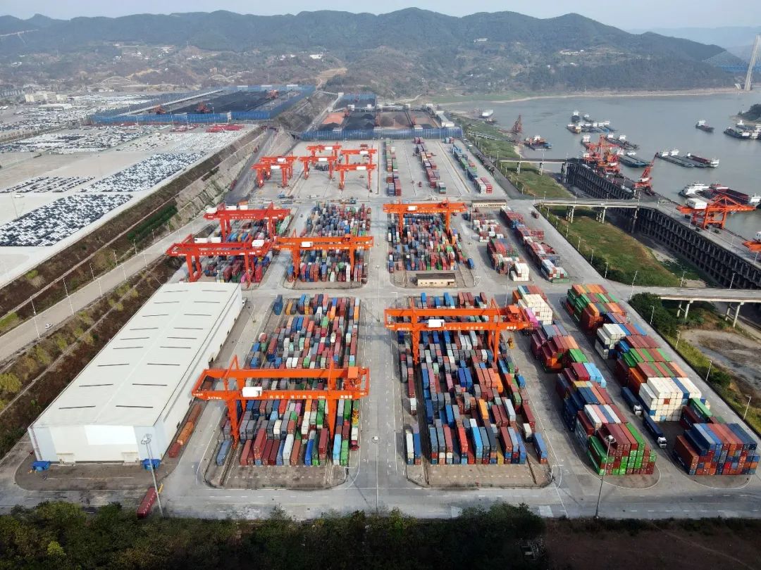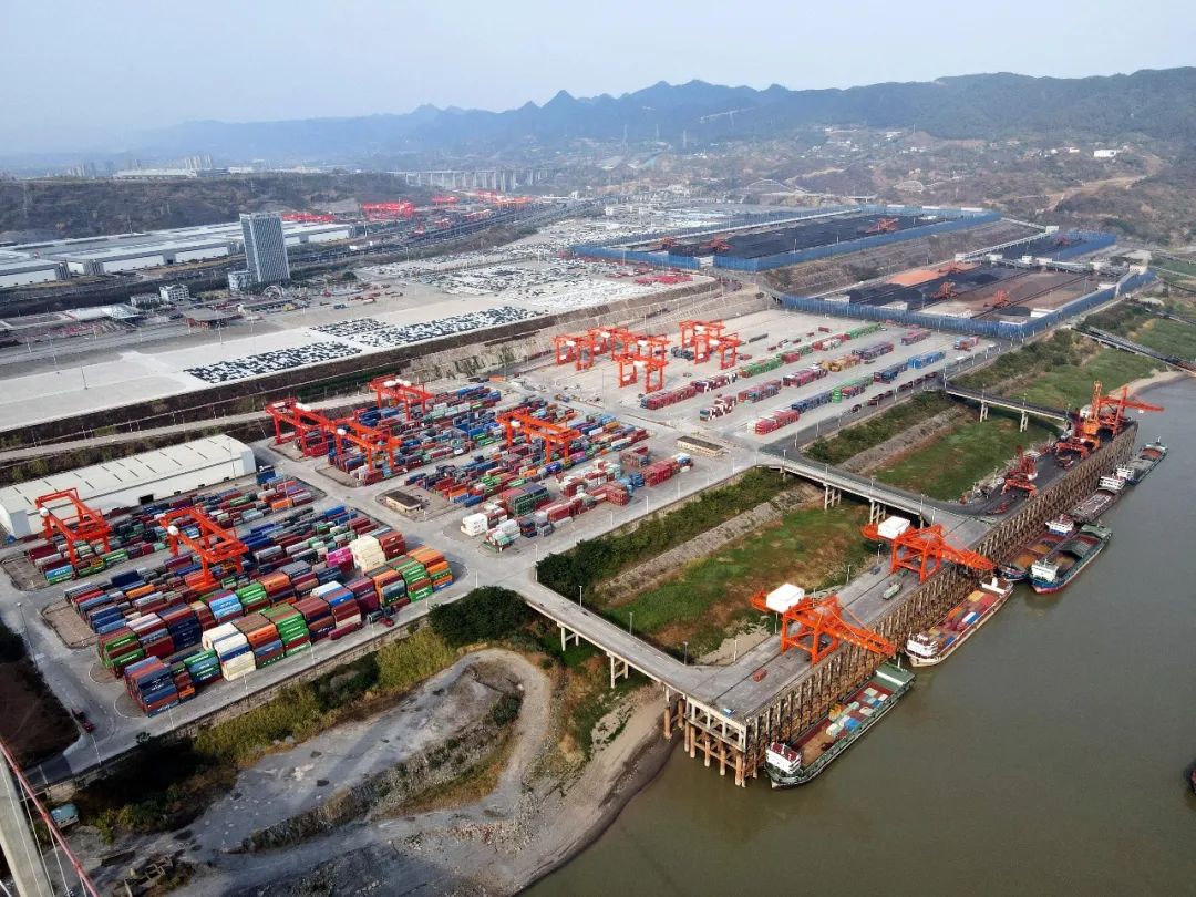 往来的货船,橘红的码头起重机,鳞次栉比的集装箱和,缓缓驶出的班列,折射出重庆果园港,一派繁忙有序的生产运营图景。