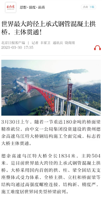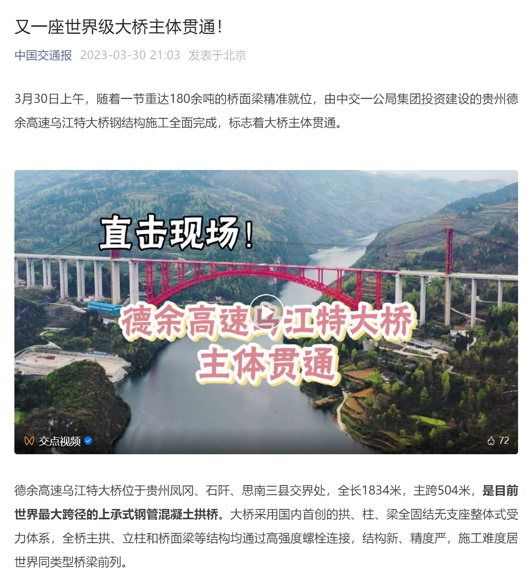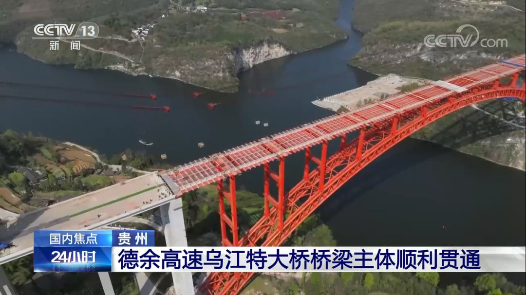 德余高速乌江特大桥全长1834米,主跨504米,是目前世界最大跨径的上承式钢管混凝土拱桥。大桥采用国内首创的拱、柱、梁全固结无支座整体式受力体系,全桥主拱、立柱和桥面梁等结构均通过高强度螺栓连接,结构新、精度严,施工难度居世界同类型桥梁前列。